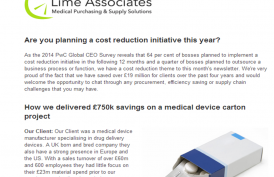As the 2014 PwC Global CEO Survey reveals that 64 per cent of bosses planned to implement a cost reduction initiative in the following 12 months and a quarter of bosses planned to outsource a business process or function, we have a cost reduction theme to this month’s newsletter. We’re very proud of the fact that we have saved over £19 million for clients over the past four years and would welcome the opportunity to chat through any procurement, efficiency saving or supply chain challenges that you may have.